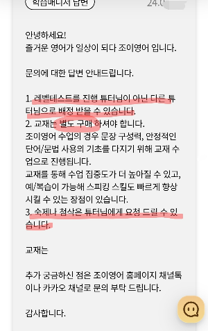 궁금한 점은 1:1 문의도 있지만, 카톡으로도 정말 빠르게 상담할 수 있어서 좋았어요. 홈페이지 설명이나 네이버쇼핑에 나온 설명을 보면 아시겠지만, 선생님 선정에 대한 자부심이 상당하더라고요. 그래서 왠지 더 믿음이 가고, 한다면 여기를 해야겠다는 생각을 했습니다. 아이가 제일 좋아했어요.